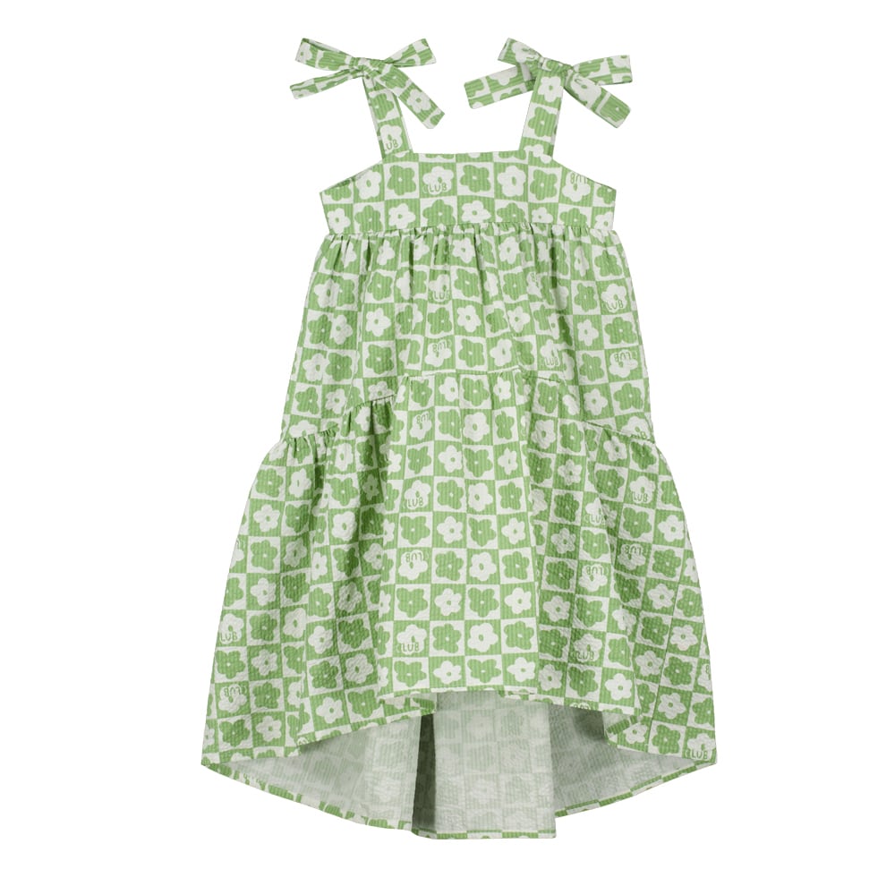 オリーブグリーンのチェッカーボードプリントが印象的なドレス。